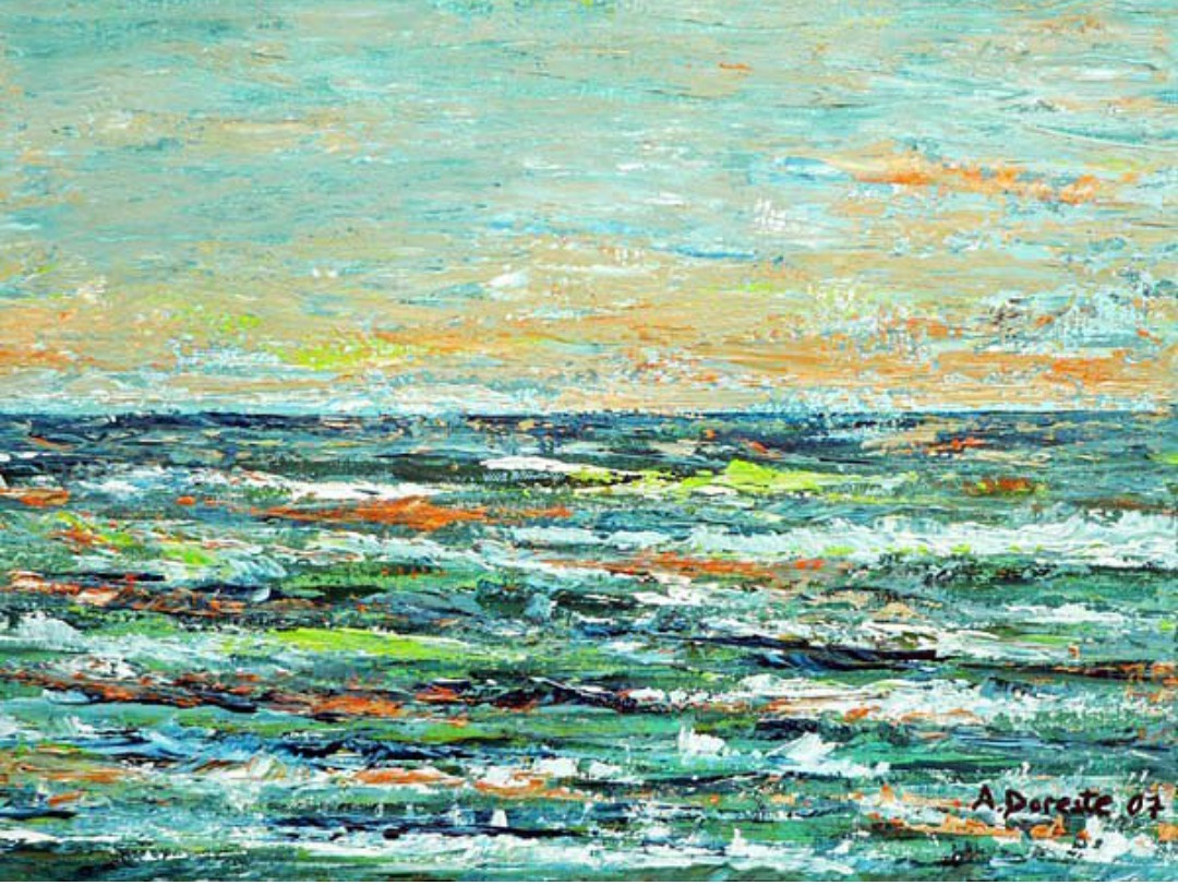 Las pinceladas gruesas y texturizadas sugieren movimiento y energía, transmitiendo la vitalidad del océano en constante cambio. El horizonte se pierde suavemente en un cielo con matices cálidos, creando una sensación de calma y contemplación.