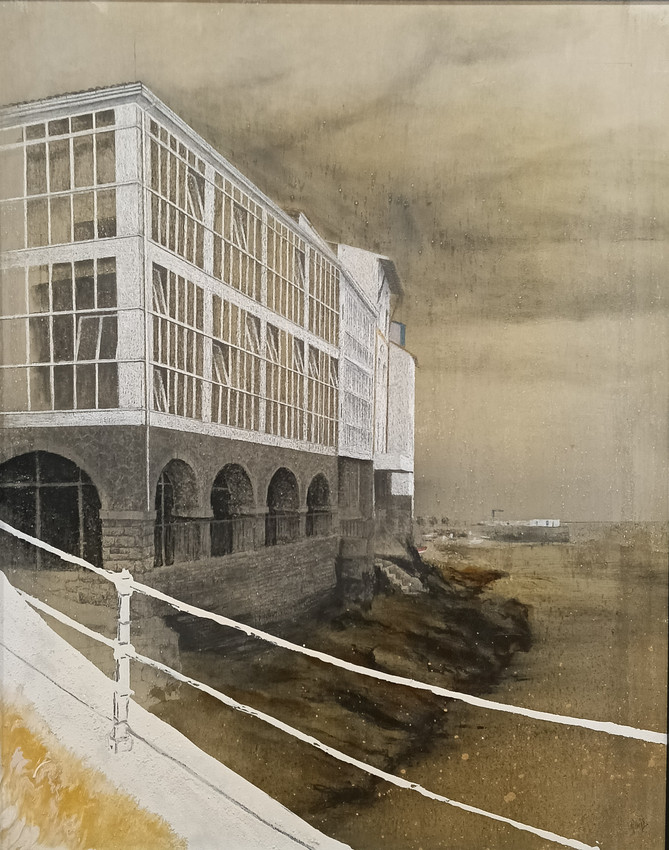 Paisaje de la ciudad de Aviles en la ría, realizado cobre tabla con resinas, barnices, pigmentos, grafito y lápices de colores
