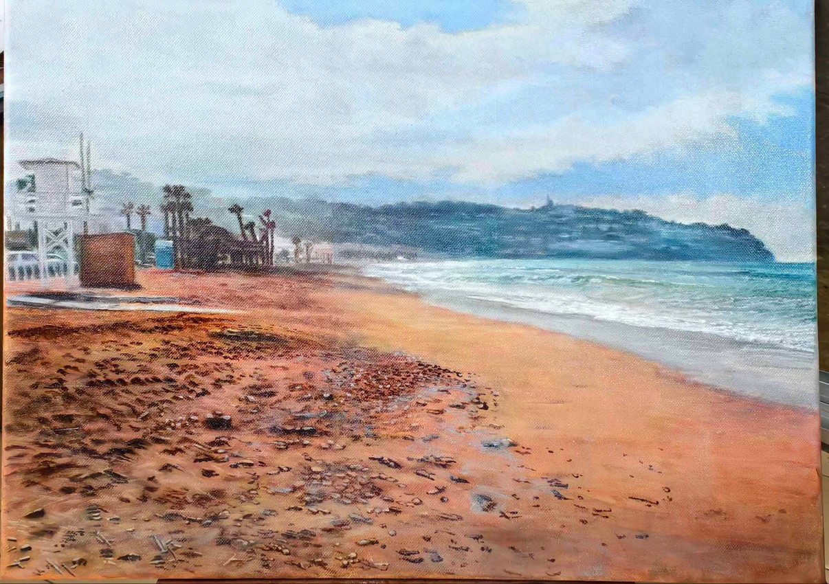 Este óleo captura la serenidad de una playa mediterránea tras el paso del agua, en un instante donde la naturaleza y el silencio parecen fundirse.