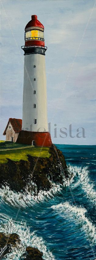 Óleo sobre lienzo de 80 x 31 cm. Escena marina de un faro costero con un mar rompiendo en el acantilado.