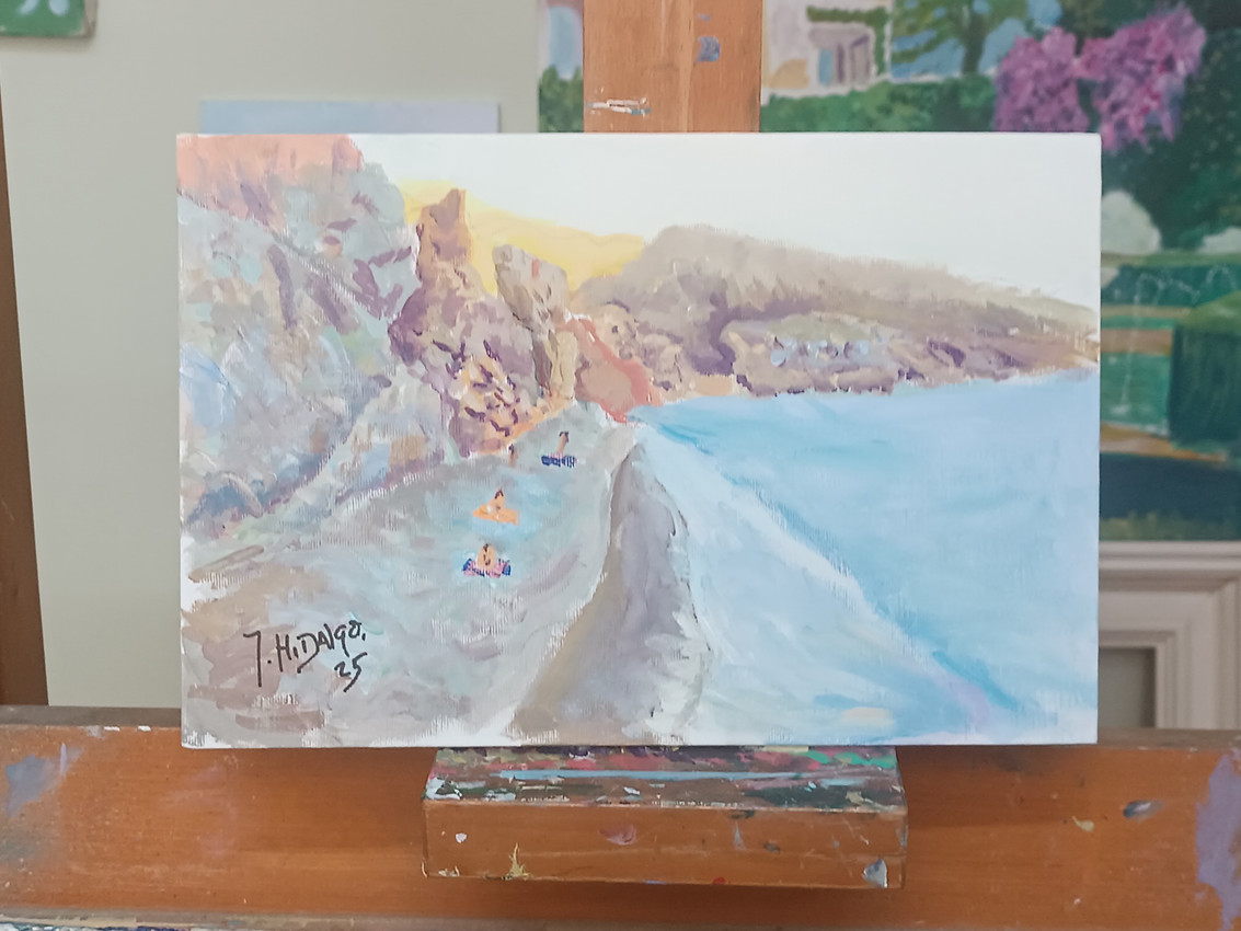 Comienzo a dibujar a los 10 años. Me empieza a entusiasmar el color, practico con sanguinas y pigmentos al agua. unos anticuarios de mi barrio me encargan algunas copias pagándomelas. a partir de aquí sigo pintando con óleos de muy mala calidad. me traslado a Madrid, conozco a mi maestro (Jose Maria Zamatan, alumno de Martiarena de la escuela de Zuloaga), aunque antes había estudiado las obras de Morcillo (Pintor de mi tierra, Granada),. en adelante vivo de encargos, sobre todo retratos en Cartagena (Murcia) granada, Madrid y Becerril de la Sierra (Guadarrama). En los 1987... Subasto varias obras en la sala de subastas de Duran , en la calle Serrano. Sigo viviendo del encargo de retratos y paisajes. he pensado en una exponer y subastar mi obra. mi cotización es de 172€ el punto; es decir, 172€ por el número del bastidor. atentamente Jaime Hidalgo