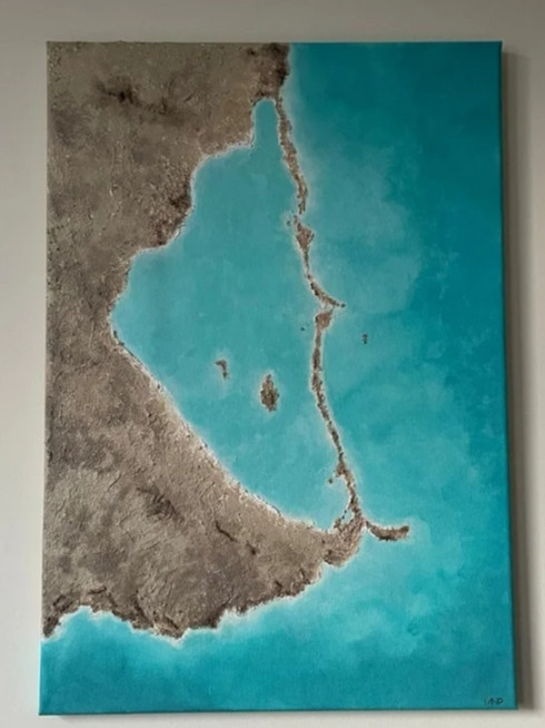 Esta obra combina pintura y relieve para crear una pieza artística tridimensional que transforma cualquier espacio. Las texturas generan profundidad real, haciendo que cobre más realismo la representación de la costa murciana y Cartagenera.