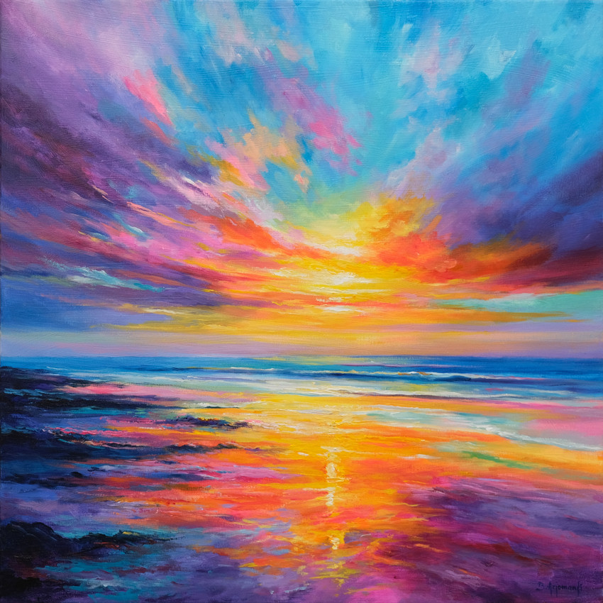 Una pintura original que expresa un paisaje marino fantástico y un atardecer colorido.