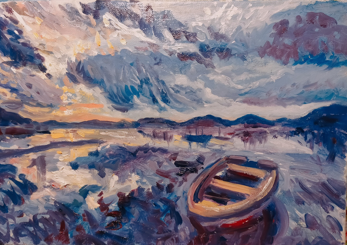 Pintura en óleo sobre lienzo que muestra una pequeña barca junto al mar.