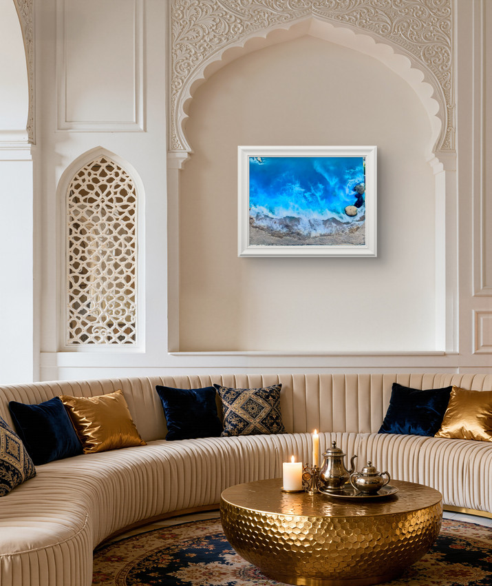 Esta obra de arte en resina epoxi de alta calidad recrea magistralmente una vista aérea de la orilla. Los tonos de azul turquesa profundo y blanco espumoso simulan las olas rompiendo con un realismo vibrante, ofreciendo una sensación de movimiento y tridimensionalidad inigualable. La inclusión de arena natural aporta una textura táctil y autenticidad costera, fusionando el arte con elementos del paisaje real.