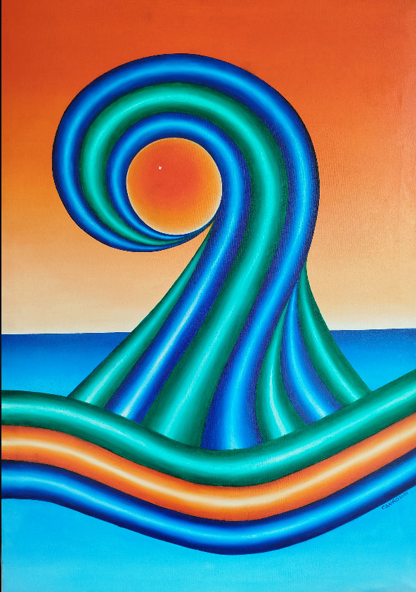 Representación figurativa, simétrica y surrealista de la ola sobre el mar, bajo un atardecer, coincidiendo con la puesta de sol, lo que hace alusión al brillo de la perla que emerge del océano.