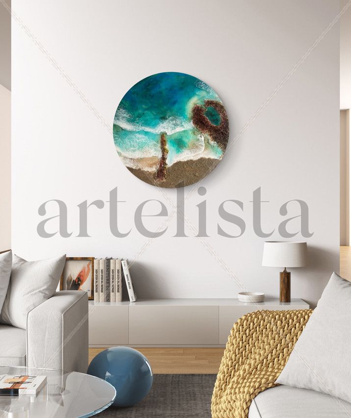 Pieza circular de 40 cm de diámetro, elaborada sobre base de madera de okume. Esta obra captura la esencia del océano con una perspectiva aérea que combina aguas turquesa, espuma blanca y texturas naturales de arena y roca.