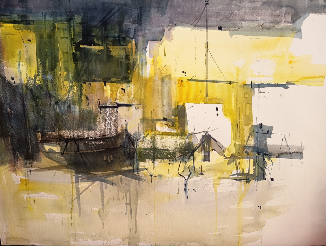 Watercolour on Arches paper, 75x55 centimetres. Port atmosphere. Lights and shadows are recreated to create an atmosphere that we recognise and that offers us a fully decorative painting. Unique piece.