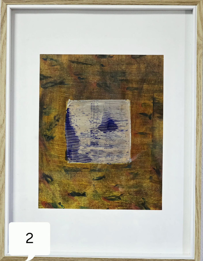 En el centro de la obra destaca un rectángulo de bordes irregulares en color blanco, sobre el cual se distribuyen líneas horizontales de pigmento azul oscuro. Estas líneas no son uniformes; presentan variaciones en densidad y continuidad, creando formas sugerentes, como diagonales o agrupamientos más intensos. El contraste entre el fondo cálido y el rectángulo frío y lineal produce un foco visual claro, aportando tensión y equilibrio a la composición.