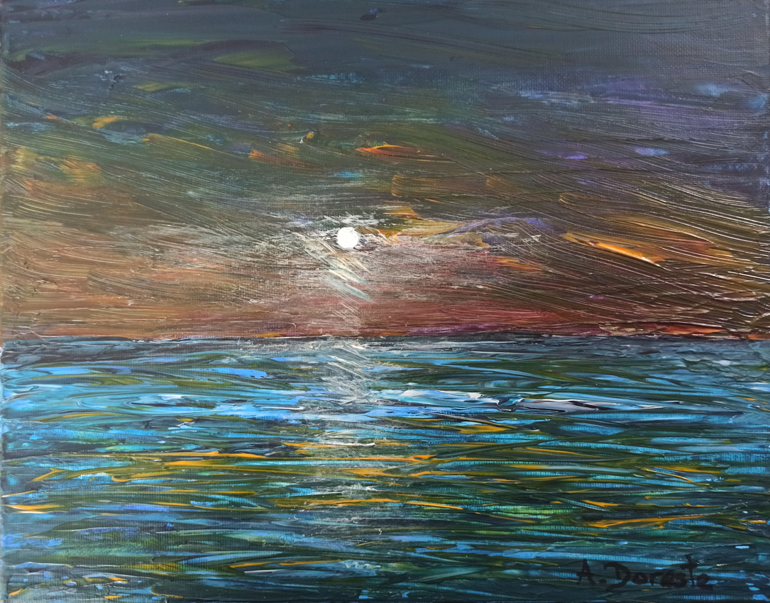Un mar nocturno se extiende en pinceladas profundas de azules, ocres y verdes, inquieto pero sereno. En el centro, la luna —pequeña y firme— rompe la oscuridad y derrama un sendero de luz plateada sobre el agua. El cielo, cargado de sombras y destellos cálidos, parece moverse con el viento, como si la noche respirara. Todo vibra: no hay quietud total, solo un diálogo constante entre luz y oscuridad, calma y misterio.