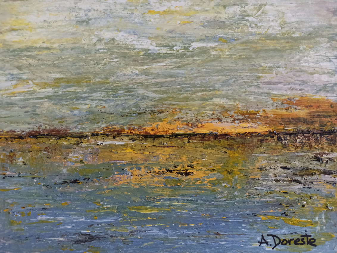 La composición recuerda a un horizonte al atardecer: en la parte superior, el cielo aparece con matices de verde grisáceo y amarillo claro; en el centro, una franja anaranjada evoca la luz cálida del sol ocultándose; en la parte inferior, reflejos de esos colores vibran sobre una superficie acuosa azulada, sugiriendo el mar en calma.