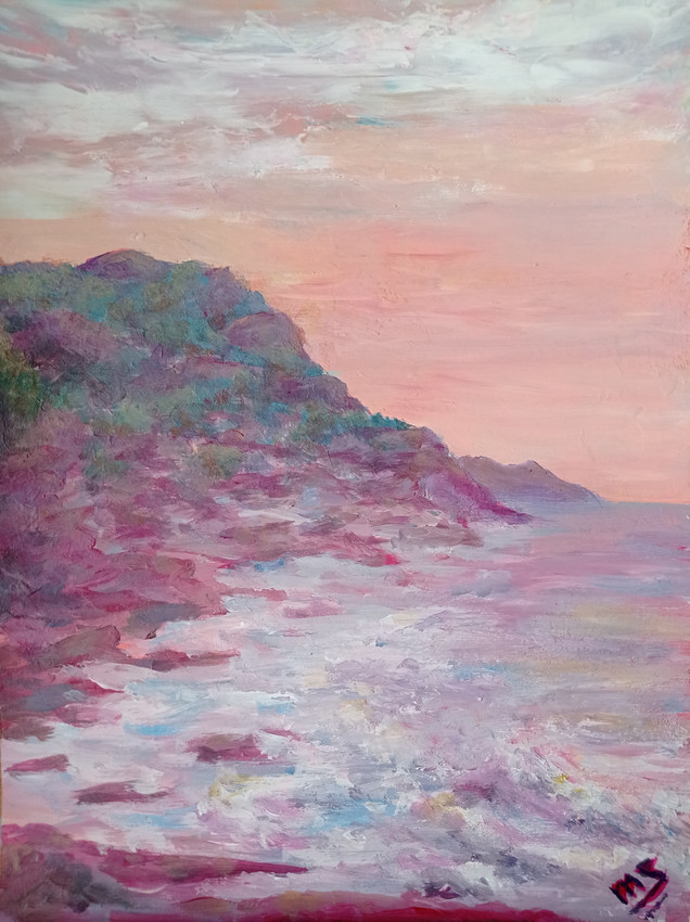 Una marina delicada donde el mar y el cielo se funden en una danza de tonos pastel. En esta pieza, el acantilado se suaviza bajo una luz crepuscular, mientras las olas rompen en la orilla con una mezcla de púrpuras, azules y rosas. He buscado capturar ese momento de paz en el que se vislumbran las primeras luces del alba, en el que todo se vuelve una atmósfera de color y bruma marina.