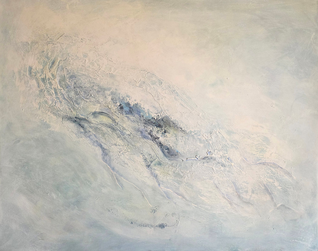 Esta obra es una composición abstracta dominada por tonos suaves y apagados, principalmente azules pálidos, grises gélidos y blancos rotos cremosos. La atmósfera general transmite calma y paz.
