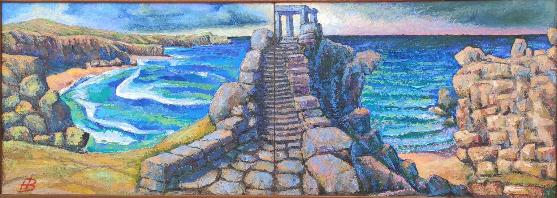 Картина маслом на двух щитах ДСП, представляющая собою как бы диптих в единой раме. В основу композиции взято Керченское побережье Азовского моря с руинами святилища предположительно Девы Меотиды.