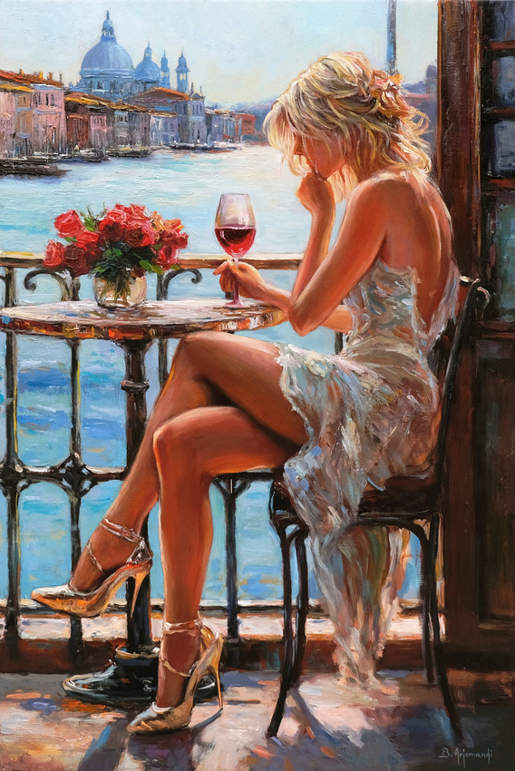 Sumérgete en un momento de elegante serenidad con esta cautivadora pintura al óleo. Una mujer de gran elegancia, vestida con un delicado vestido blanco, disfruta de un vaso de vino tinto en un soleado balcón veneciano. La suave luz de la tarde baila sobre las aguas onduladas del Gran Canal, mientras un ramo de rosas añade un toque romántico y vibrante. Las pinceladas, llenas de textura y calidez, crean una escena serena y llena de emotividad.