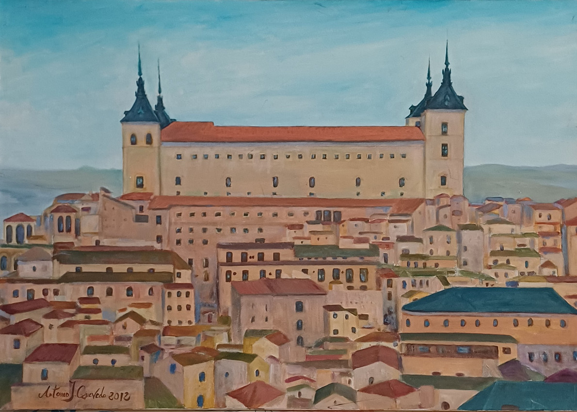 Vista de la ciudad de Toledo con el imponente Alcázar en posición central y frontal, dominando la composición. En la parte inferior se representa un plano urbano e⁸squemático, que realza la monumentalidad del Alcázar como símbolo histórico y arquitectónico. La obra combina detalle y síntesis, transmitiendo la fuerza de un lugar cargado de historia y cultura.