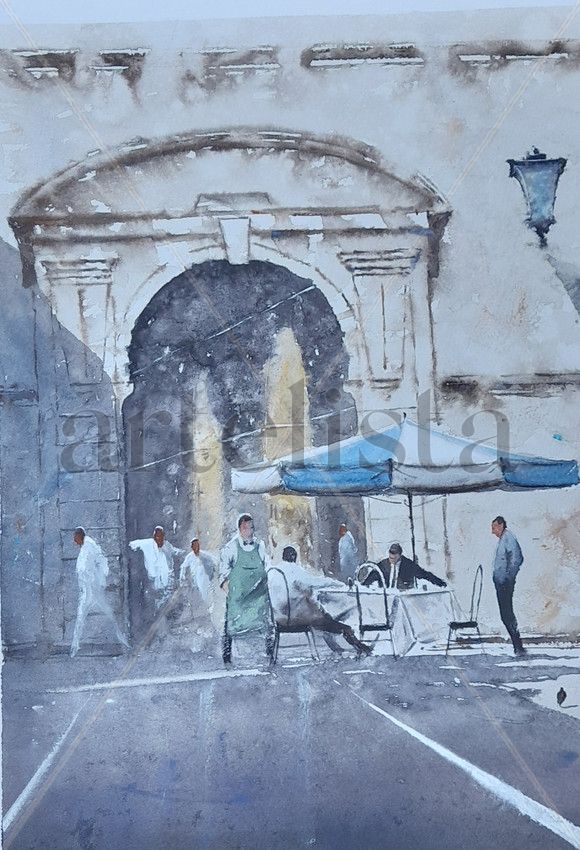 La acuarela describe una escena urbana en la puerta de un restaurante en la ciudad de Roma. Jugando con las sombras, el interior del viejo edificio, la hermosa y desgasta fachada. Recreando el ambiente de una tarde en esa ciudad.