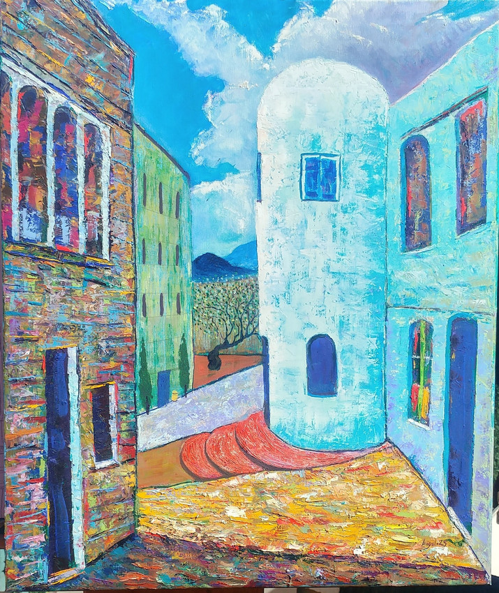 Calles de Mojacar forma parte de una serie de pinturas realizadas en el verano de 2025. Óleo sobre tablero.