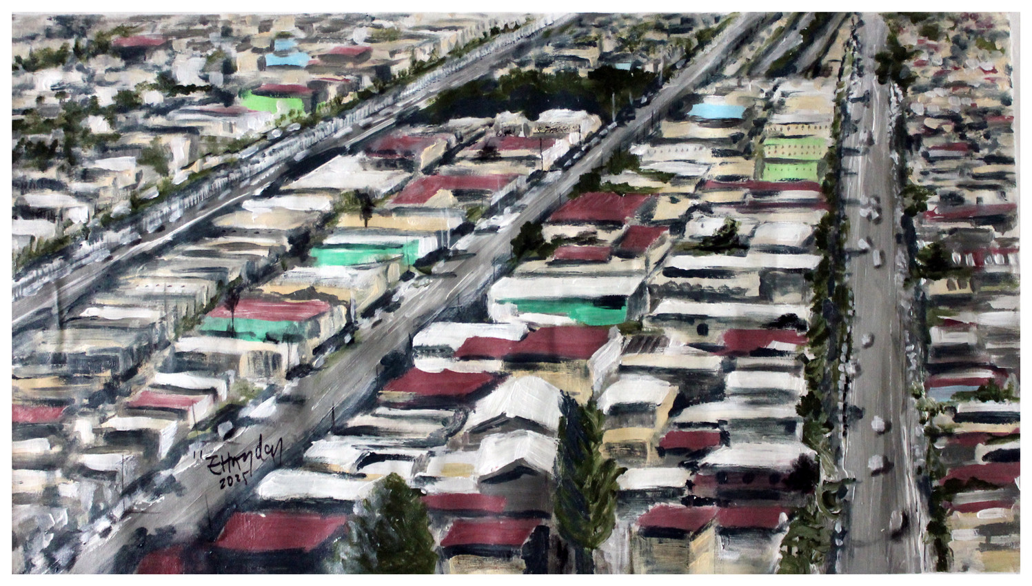 varias calles de Ensenada, Baja california, captado a las 10 am desde un mirador elevado. pintura impresionista.