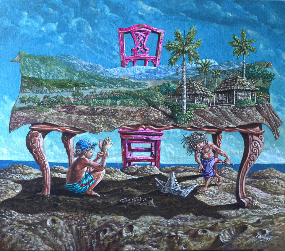 LA MESA SE ENCUENTRA EN LA ARENA DE UNA PLAYA. CUAL MANTEL, UN PAISAJE CUBANO IMAGINADO Y DEBAJO DE ELLA DOS NIÑOS, DANDO RIENDA SUELTA A SU IMAGINACIÓN SE DISFRAZAN Y JUEGAN.