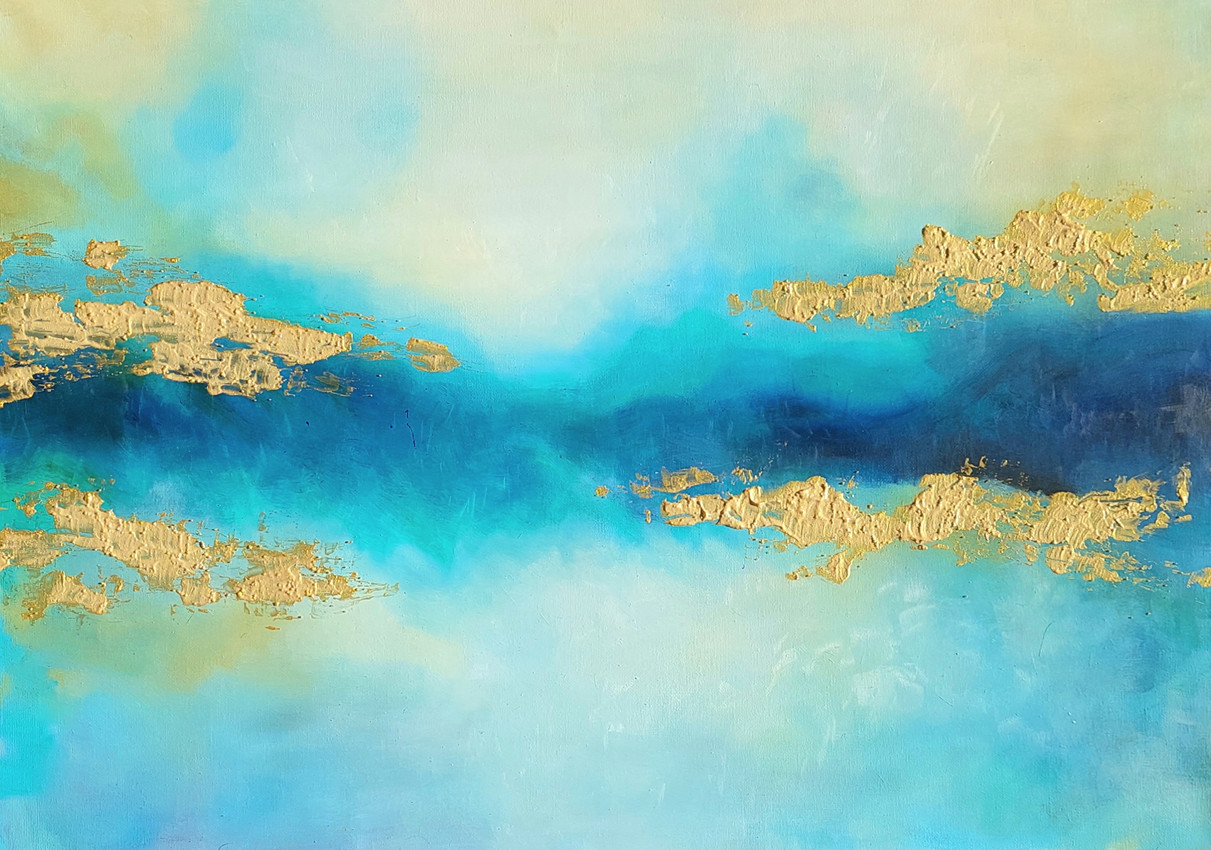 The contrast between the fluid movement of the color and the solidity of the gold expresses the balance between emotion and strength, between fragility and value. It is a work that speaks of transformation: light emerges from the depths, and from silence something eternal is born.