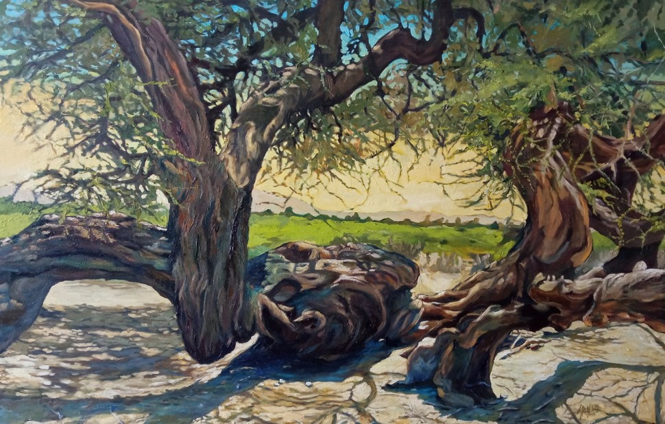 pintura al oleo sobre lienzo de un huarango, árbol milenario e Ica -Perú