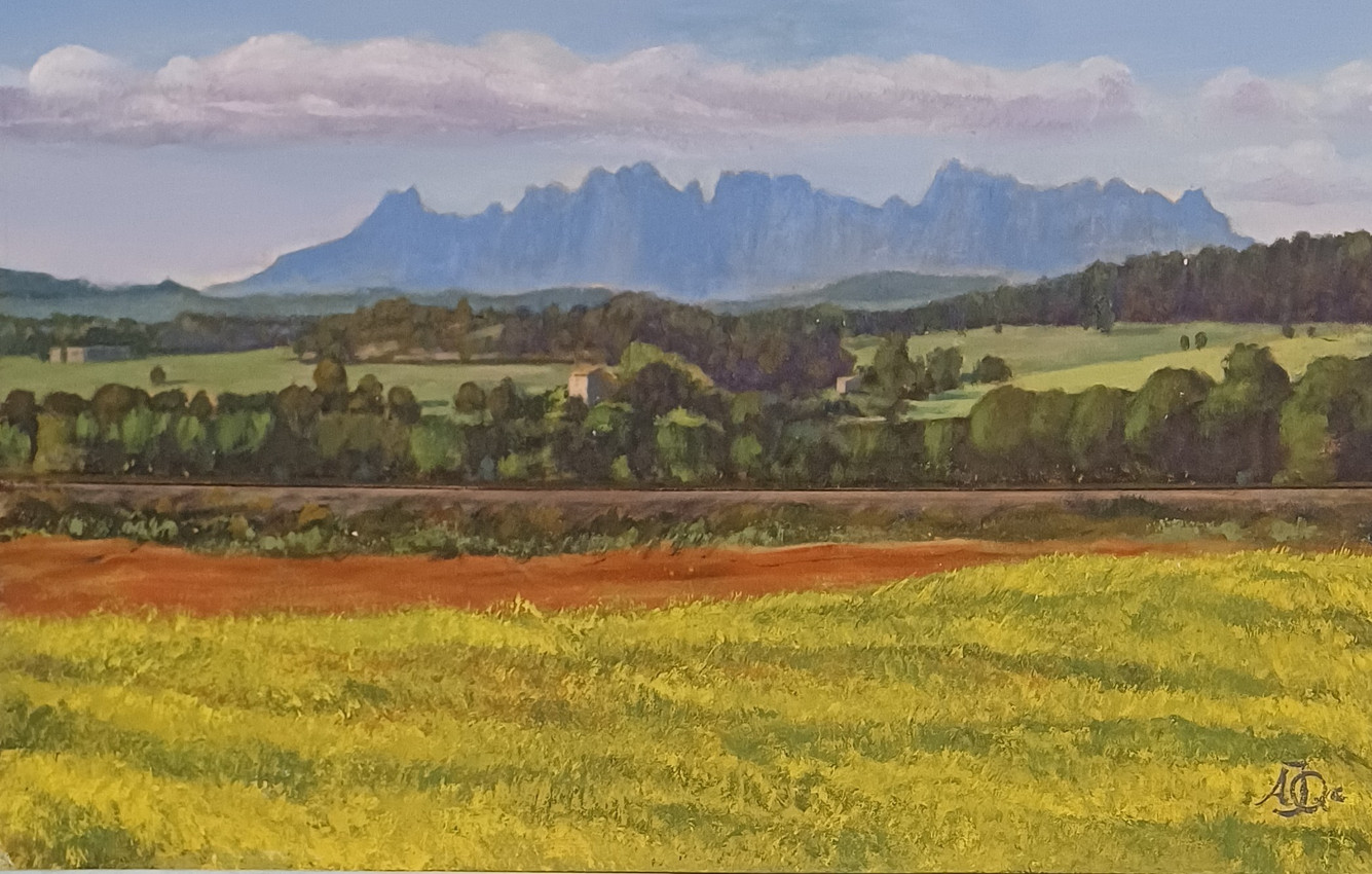 Acrílico sobre canvas board de 44 x 70 cm que ofrece una vista panorámica de los alrededores de Montserrat, con la icónica montaña dominando el horizonte. La composición horizontal guía la mirada por la vía ferrea desde campos verdes y amarillos, pasando por una franja de vegetación y pequeñas construcciones, hasta la majestuosa silueta azulada de la montaña.
