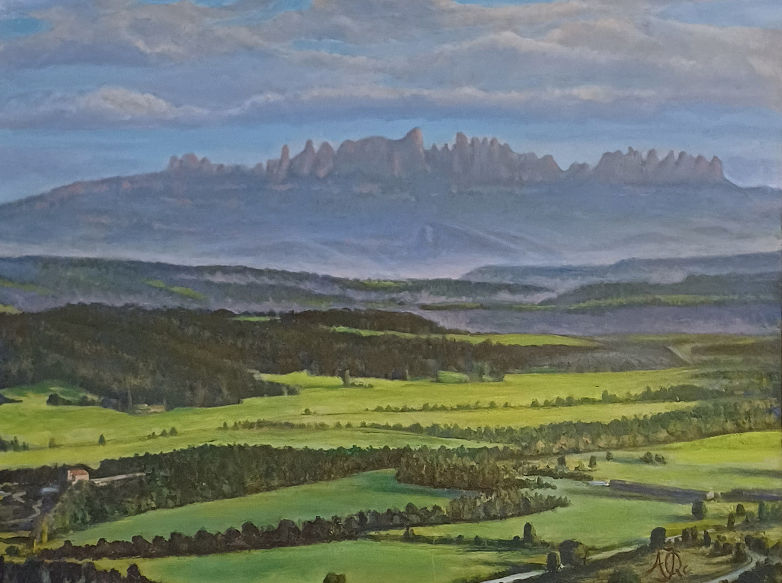 Acrílico sobre canvas board de 77 x 60 cm que representa los alrededores de Montserrat, con la icónica silueta del macizo al fondo. La composición guía la vista desde un primer plano de campos primaverales y árboles densos hasta las montañas azuladas, creando profundidad y equilibrio visual.