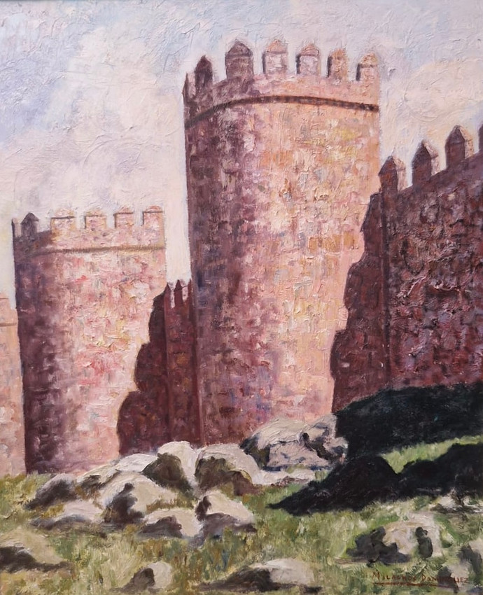Vista de la Muralla de Ávila con césped en primer plano. La obra resalta la majestuosidad histórica del monumento y su entorno natural.