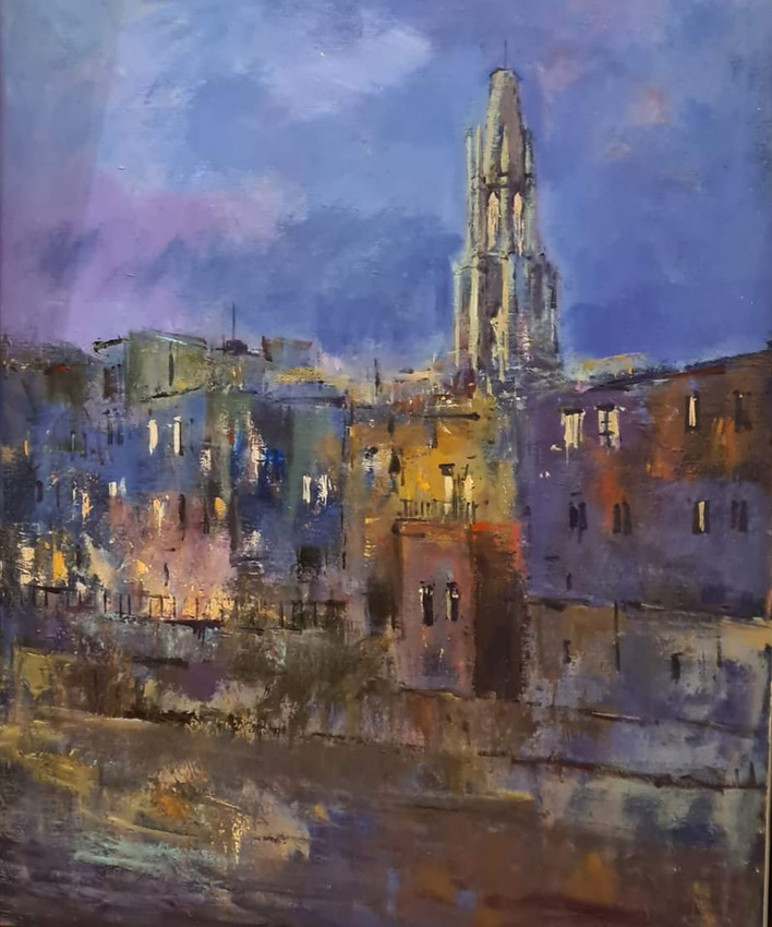 Vista nocturna de la iglesia de San Félix y las emblemáticas casas del río de Girona