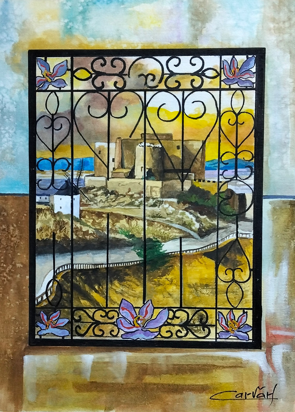 La imagen muestra al Castillo de Consuegra y la flor del azafran a través de una reja inacabada, simbolizando que nuestra visión del pasado es siempre incompleta y filtrada por el presente.