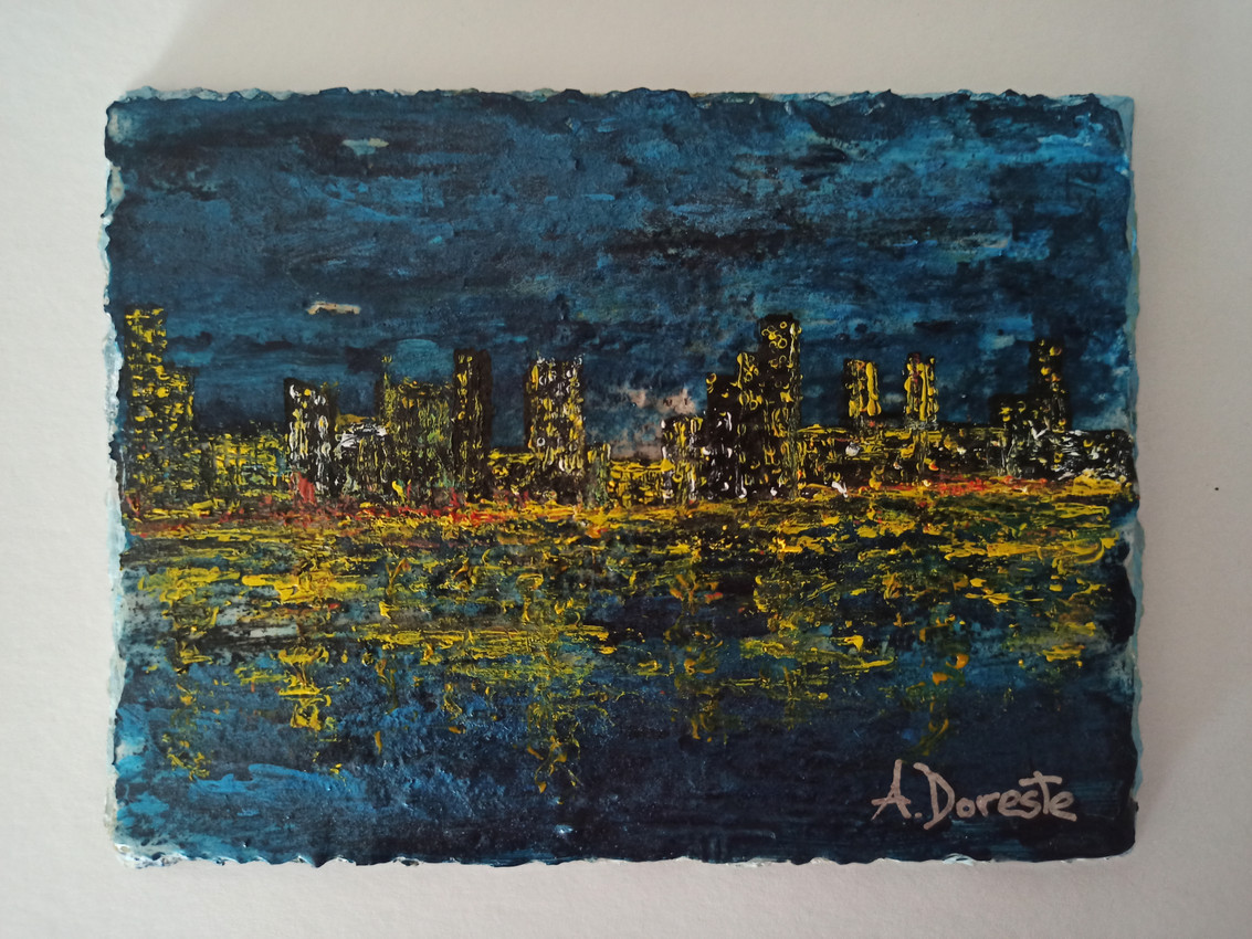 Este cuadro muestra un paisaje urbano nocturno, con una serie de rascacielos iluminados que se reflejan sobre el agua. El cielo oscuro y las pinceladas azules profundas contrastan con los destellos amarillos y anaranjados de las luces de la ciudad, creando un efecto vibrante y dinámico. La textura gruesa de la pintura aporta una sensación de movimiento tanto en el agua como en el cielo, evocando la vitalidad de una gran metrópolis vista desde la distancia.