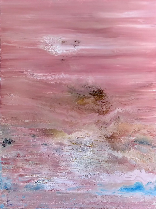 Esta obra de arte presenta un exquisito paisaje abstracto, dominado por una paleta de rosas suaves y tonos tierra contrastantes. Las pinceladas fluidas se fusionan a la perfección, creando la ilusión de un cielo sereno y onírico que desciende hacia un horizonte brumoso. La textura única da la impresión de que los colores fluyen fundidos, atrayendo al espectador hacia la profundidad de la composición. Sutiles toques de azul y blanco enriquecen la pieza, sugiriendo aguas o cielos lejanos, mientras que los intrincados patrones aportan movimiento dinámico y complejidad. La maestría del artista con los degradados de color y los contrastes de texturas transforma el lienzo en una vívida representación de la tranquilidad de la naturaleza. Esta cautivadora pieza invita a la contemplación y evoca una sensación de calma, realzando cualquier espacio con su belleza etérea y elegancia minimalista, personificando el arte abstracto moderno con un toque de serenidad atemporal.