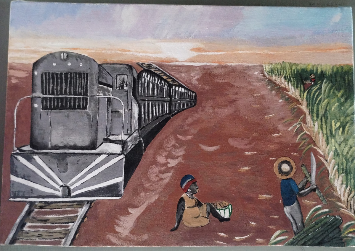 Landscape. Paisaje de amaneceres en cañaverales de la República Dominicana. Hombre cortando caña de azúcar , tren de caña y mujer vendiendo panes.