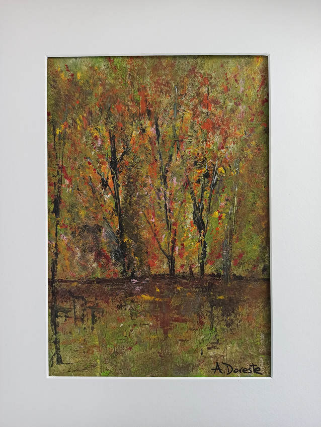 Este cuadro muestra un paisaje otoñal lleno de calidez y textura. Los tonos predominantes son el verde, amarillo, naranja y rojo, que evocan la transición de las hojas en pleno otoño. Las pinceladas son sueltas y vibrantes, lo que aporta un aire de abstracción lírica, en el que los árboles se levantan estilizados con troncos oscuros y ramas apenas esbozadas, mientras que el follaje parece un tapiz de colores que se funden entre sí.
