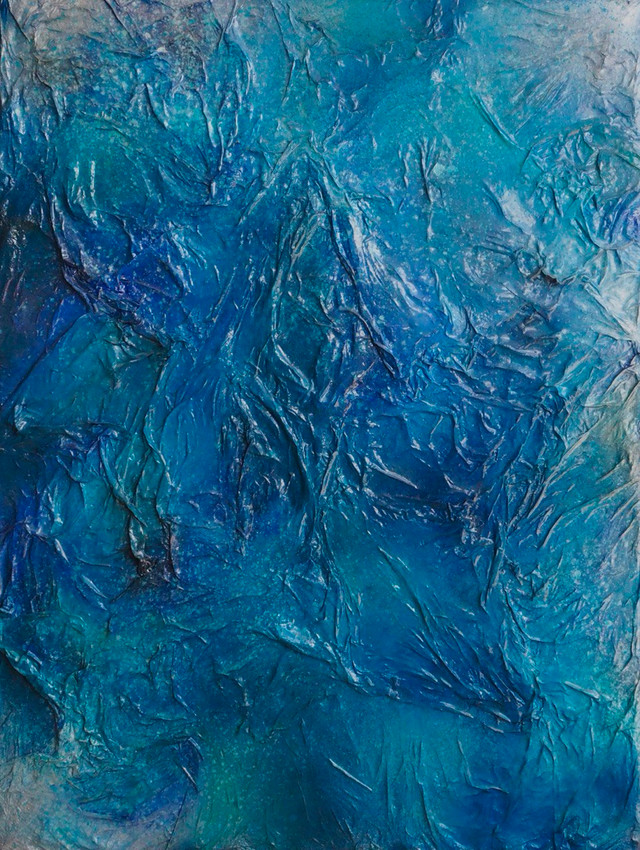 Descripción: Una obra que pertenece a la colección "Arrecife", se trata de un cuadro abstracto con textura inspirado por las aguas de la isla mediterránea de Tabarca. Acrílico sobre lienzo, con tonos azules y plateados.
