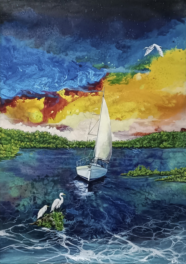 Esta obra nos transporta a un escenario de serena belleza y profunda introspección. Con sus dimensiones de 32 x 24 pulgadas, la obra captura un momento de tranquilidad en un entorno acuático, bajo un cielo vibrante y lleno de contrastes.