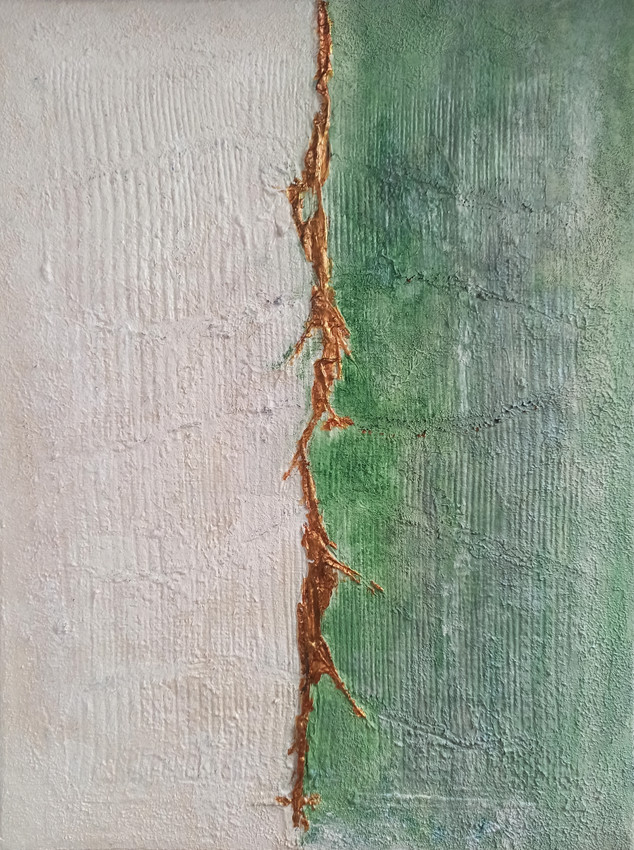 La pintura muestra una superficie dividida en dos campos de color y textura. A la izquierda predomina un blanco áspero y claro, mientras que a la derecha aparece un verde profundo con vetas verticales. En el centro, una grieta vertical se abre paso como una cicatriz entre ambos lados. De esa grieta emerge una forma irregular de color óxido, con ramificaciones que evocan raíces o pequeñas ramas que se extienden hacia los lados.