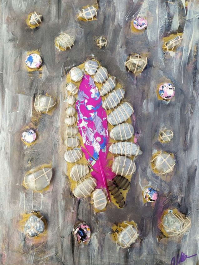 Acrílico sobre lienzo, con piedras, madera y pluma