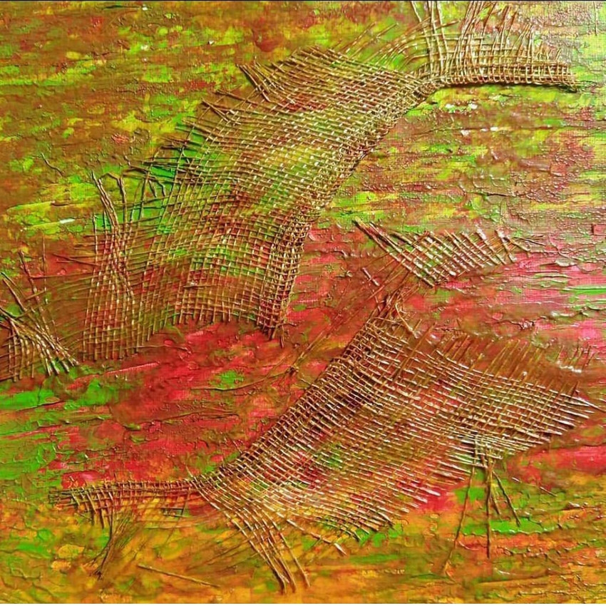 Esta obra presenta una textura vibrante y dinámica, donde predominan los tonos cálidos —rojos, naranjas y verdes— que se mezclan con verdes intensos, generando una sensación de movimiento y energía orgánica. Las formas trenzadas con redes emergen y se disuelve entre capas de color, sugiriendo una lucha entre la estructura y la libertad del trazo.