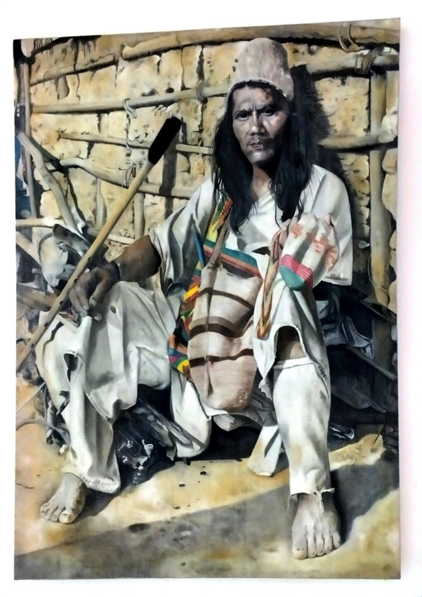 La obra muestra un retrato realista de un indígena sentado en un entorno rústico de su tierra
