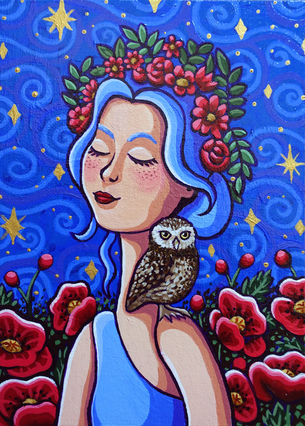 La he pintado como un ser sereno y poderoso, rodeada de flores bajo un cielo estrellado, un encuentro entre la tierra y el cosmos, la creatividad y la intuición.