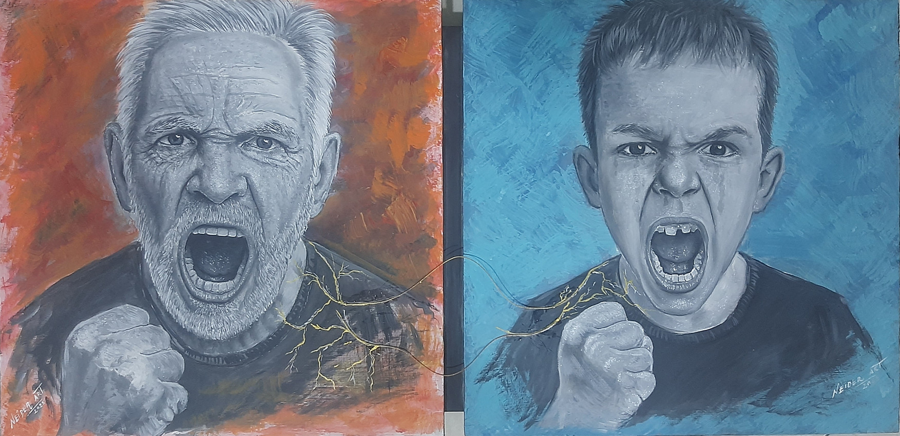 “Ecos de Ira” tecnica mixta.es un díptico que confronta al espectador con la intensidad emocional transmitida entre dos generaciones. A través de dos retratos en escala de grises —un hombre mayor y un niño— la obra captura un instante de explosión emocional, un grito que parece resonar desde el pasado hacia el futura.