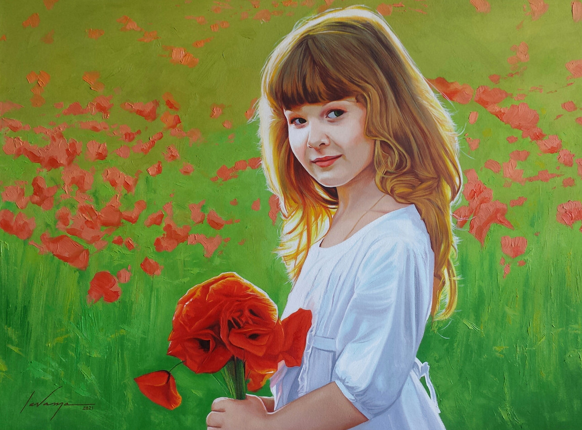 Retrato de una niña recojiendo flores en un campo de amapolas.