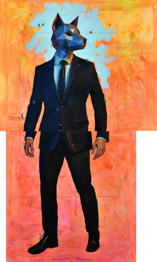 En esta pintura, una figura humana vestida con un impecable traje oscuro adopta la postura firme y segura de un líder, mientras su cabeza —geométrica, facetada, casi escultórica— representa la de un lobo. La fusión entre el cuerpo humano y el rostro animal genera una poderosa metáfora sobre la dualidad entre la racionalidad y el instinto, entre lo socialmente aceptado y lo primitivo que aún habita en nosotros.