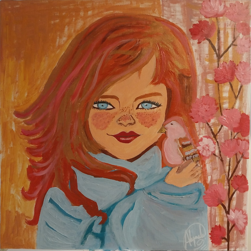 Retrato expresivo tipo naif de niña pelirroja envuelta en una manta azul claro con un pajarito y unas flores a un lado, en acrílico sobre lienzo fino de 50x50