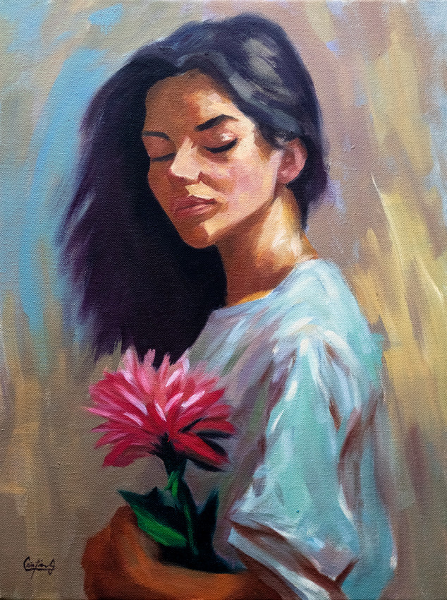 Los ojos bajos de la figura y su pose gentil invitan a los espectadores a un momento privado de gracia, mientras que la audaz flor rosa sirve como símbolo de belleza, fragilidad y renovación.