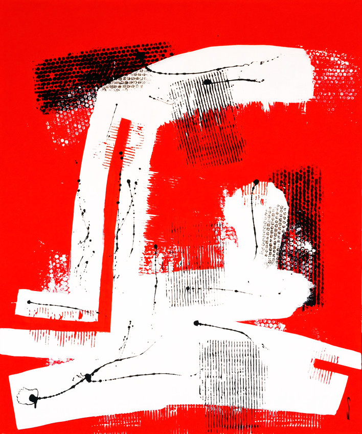 Esta cautivadora pieza abstracta presenta un fondo rojo intenso que llama la atención, contrastado con intrincadas texturas en blanco y negro. El dinámico juego de formas geométricas y líneas fluidas invita a la reflexión, mientras que los diversos patrones añaden profundidad. Cada elemento está meticulosamente dispuesto, dando como resultado una obra de arte moderna que revitaliza cualquier ambiente. Ideal para quienes buscan realzar su hogar u oficina con una pieza impactante.