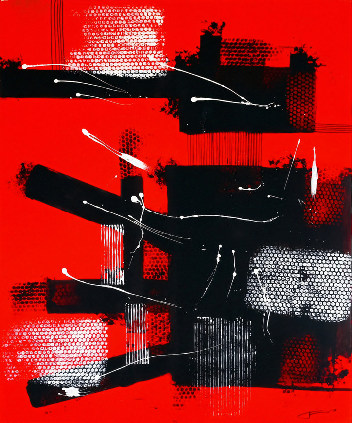 Esta impactante obra abstracta presenta una audaz interacción de rojo y negro, creando una experiencia visual dinámica. Las capas texturizadas y los elementos contrastantes evocan una sensación de movimiento, mientras que los delicados acentos blancos aportan un toque de elegancia. Cada detalle invita a la contemplación, convirtiéndola en un atractivo punto focal para cualquier espacio moderno. Ideal para quienes buscan realzar su entorno con una pieza que representa el arte contemporáneo.