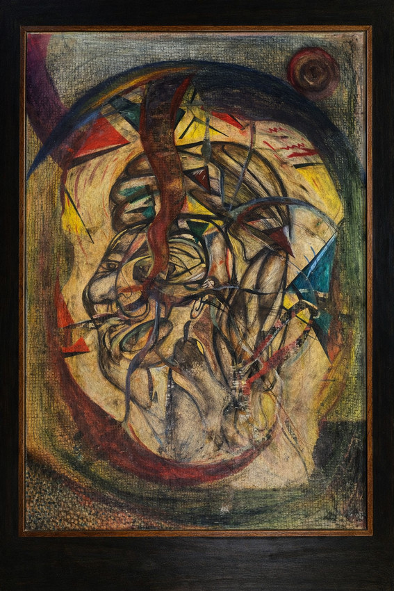 La paleta de colores tierra, interrumpida por acentos vibrantes, aporta profundidad y dramatismo, mientras que la textura visible del soporte refuerza el carácter expresivo de la pieza. Cada trazo parece responder a un impulso intuitivo, generando una composición dinámica que mantiene al espectador en un diálogo constante con la obra.